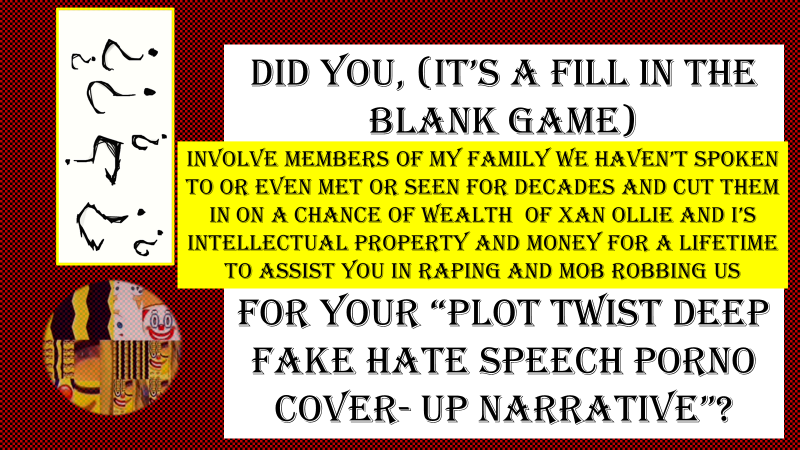 It has been crime for 21 years as I can not see any one who is involved in this and I think everyone else involved in this can see one another or a icon or photo of one another and maybe even "caught " on some kind of site or something...which must be something different from when they were just playing cards against humanity on me for 18 years and leaving playing cards in my path for batters or something who knows they are all sick as fuck and I am going to bust each and everyon'es fuckign ass...so if yu get invited to participate , decline or you could go to prison with the rest of these fucking maggots...and or ...asked or ar incited by lies to commit hurt or harm against me or my children by manufactured photshopped greenscreened footage please decline to act out by anything that these scumbag whores leeches maggots land baron criminals are asking you to do against me or my children...you will be the one who is caught in the frame closest to the victims me or my children and catch a charge, while they once again skip away again only to start the game again with other people unfairly against me which is not a game at all but straight up theft fraud identity theft stealing nasty filthy whoring porno ring which is broadcasting evidence against themselves and the corrupt pigs which has a paper trail lease distribution network etc all attached to it , and all of the gps data transmitting from the device she had illegally inserted into my body which will substantiate all of the truth and facts to crash legally and in civil and criminal court all of their lies.