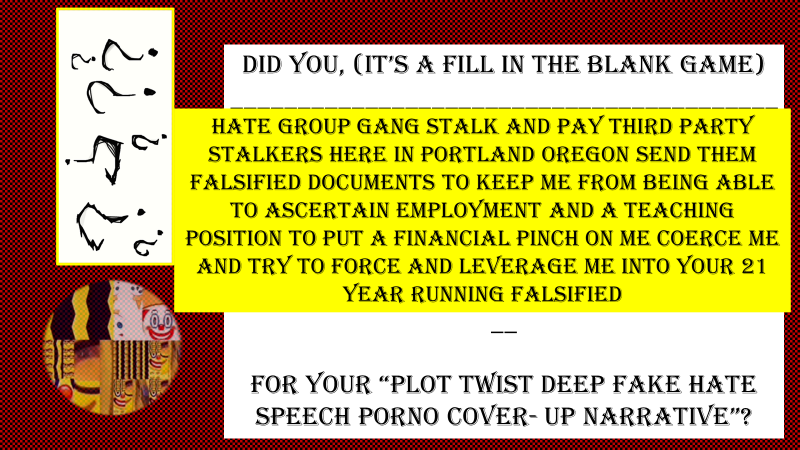 Will you be using trusted public servants with badges and guns and district attorneys to corrupt and obstruct justice today too for your ate speech porno cover up? Advocates? County  employment agencies, and social workers? Doctors? Who else will you drag into your Devil's Amway plot twist of murder greed and corruption, to save your "reputations"...what a joke. Will you be framing up innocent young people today to ruin their lives using public servants and tax payer dollars?