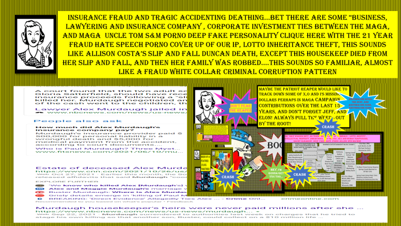 this sounds like the sleaze bag soul less brand of white collar corrupt greed mongering that has been exploiting and hate group gang robbing the kids and I for 21 years....Murdaugh's housekeeper slip and fall death, the law suit and then Murdaugh robbed her family of every dime of the insurance and settlement money...and what about the teenager they found dead on their property .....must be the same filthy demonic slithering TRUMP MAGA Evangelists Clique of Porno who is so offended by my "language"....