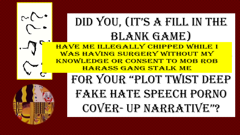 Will you be using trusted public servants with badges and guns and district attorneys to corrupt and obstruct justice today too for your ate speech porno cover up? Advocates? County employment agencies, and social workers? Doctors? Who else will you drag into your Devil's Amway plot twist of murder greed and corruption, to save your "reputations"...what a joke. Will you be framing up innocent young people today to ruin their lives using public servants and tax payer dollars?