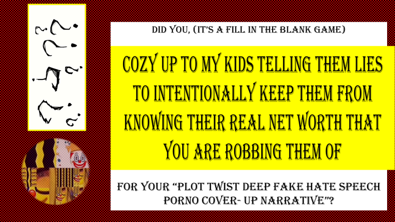 Feeling conflicted....Have you participated and been compliance by apathy and fear ....allowed your self to be fear mongered while one body after the next turns up dead? As pieces of thepuzzle fall into place and the truth is revealed do you feel repulsed that you were decevied and lead astray, and now find yourself associated with a life sentence, and or worse, connected to multiple murderss, "tragic accidents", and a grave 21 year running and counting human rights violation, and really have not gotten a cut large enough or worth the rest of your life? Are you dumbfounded by the stupidity of those who have involved you learning that they have paper trailed and broadcast decades of evidence against the entire Devil's Amway Maga Fraud ring, and want to set a really firm boundary for yourself,claiming only your actions, and none of the criminal felony state crimes that have been committed? Are you repulsed at what they have done to me , my son and my daughter 100% innocent and non consensual since day 1, 2001 , victims of fraud , deep fake , abuse of celebrity status and police government law enforcement corruption which has set up 21 years of abuse exploitation sex and human trafficking and obstruction of justice? Free yourself from the pain and guilt, and set a firm defining boundary for yourself,and file a detailed report with the FBI.Maybe your information will save your fckng ASS.