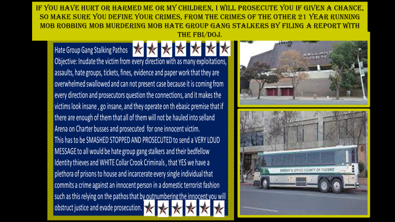 Someone bit off more than they could chew trying to make me a political prisoner, or SLAVE, or their property......I would say they need rehab or a psychiatric services, pronto. And if you fuckers think you are going to stick me and the kids below the Space Junk Runts, the Ag Trash the forging frauding Quay's , the Corrupt Fresno MAGA Pig Shit, down into the gutter beneath the Slut Shame Down Commuter Town Hookers on a Ponzi Scheme Fishbowl IP inheritance benefactor estate gifting racket you all built off of me and my Fckng kids, our money and assets...you are all begging to spend the rest of your time on earth , incarcerated. You need to get off of Kedeis' crack pipe. We aren't going to head your 2 decades of fraud forgery and tax evasion hate speech rhetoric mass shooting and capitol storming for you either....And I am going to repeat this again I am not paying one penny for your 21 year running deep fake cover up to identity theft fraud me and my kids, and I am not a MAGA so any monies of mine that you stole and used to buy off all of these crooked cops judges politcians etc to obstruct justice for 21 years and keep me and my kids locked into your weirdo S&M porno platform of power tripping ego maniac pseudo Republicans and Christians ....is going to need to be repaid to me...because I am not funding and or supporting any of this racist Oligarchy Porno Personality shit...F* NO!